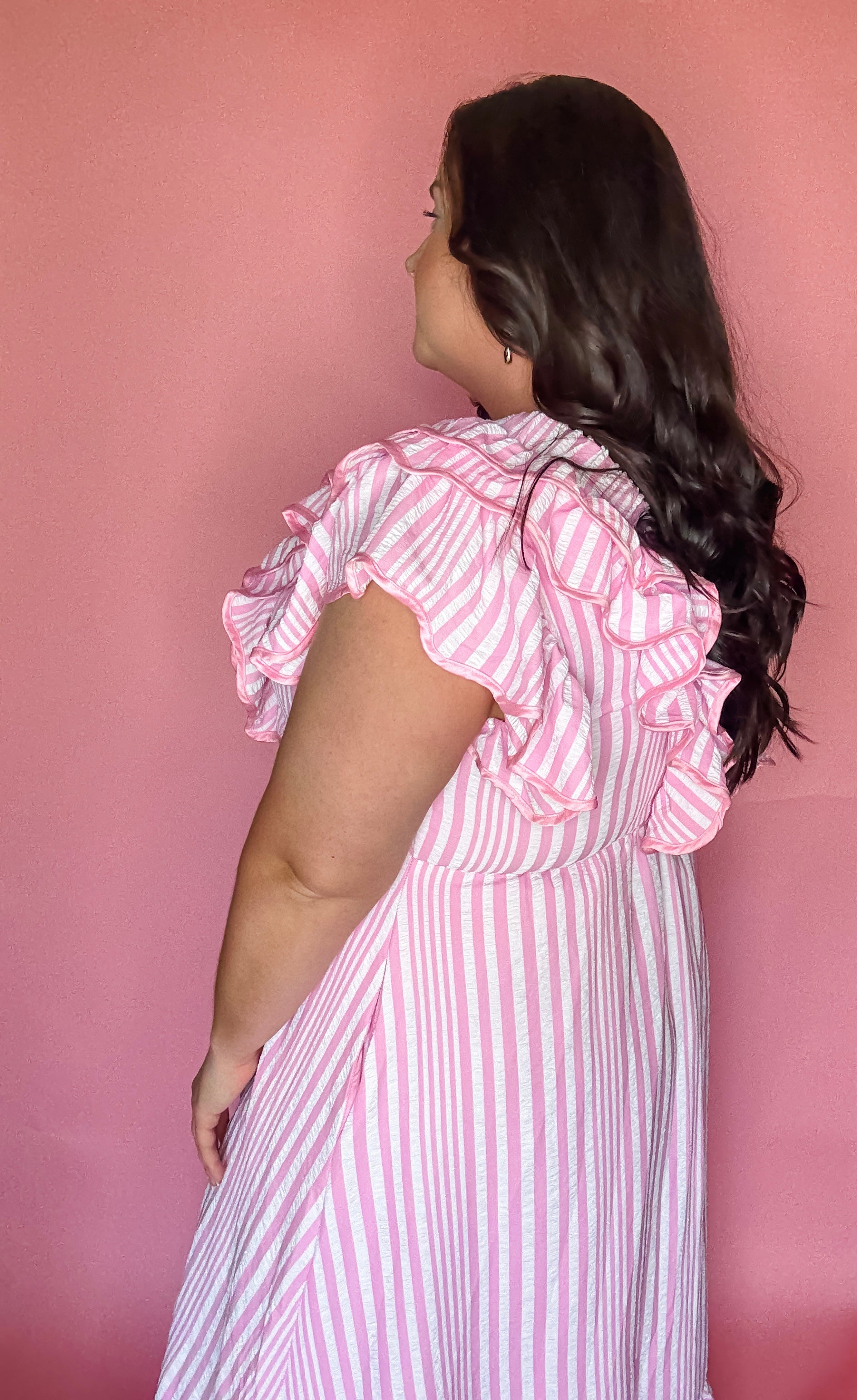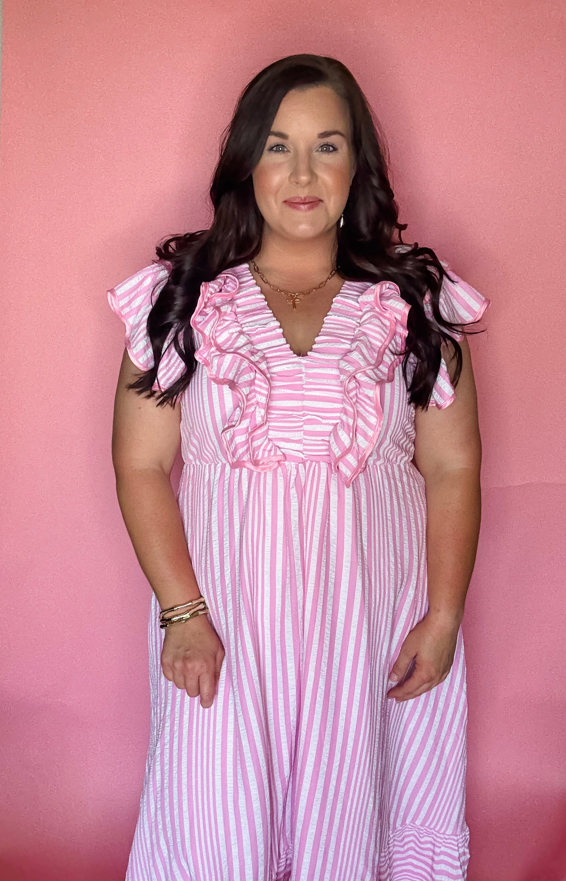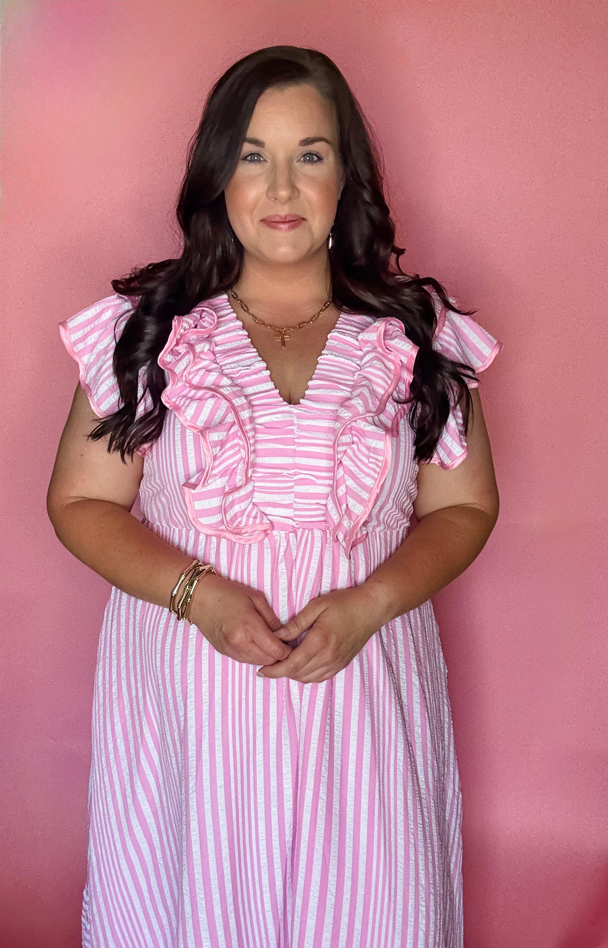 Indulge in the timeless elegance of our Amelia Dress. This pink and white striped midi dress boasts delicate ruffle cap sleeves and a flattering ruched v-neckline. Let the vertical striped pattern elongate your silhouette as you make a statement in this classic and sophisticated piece.