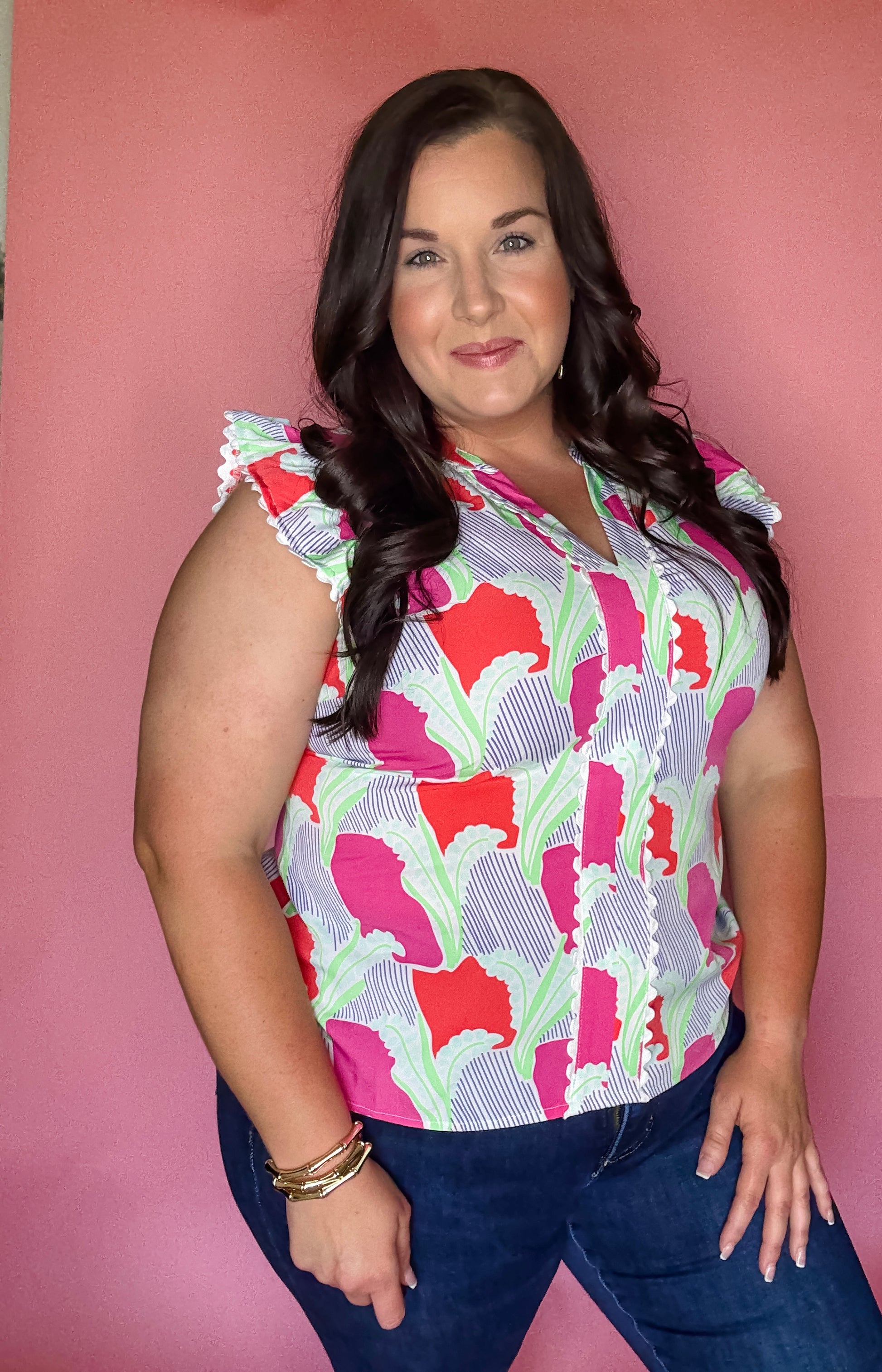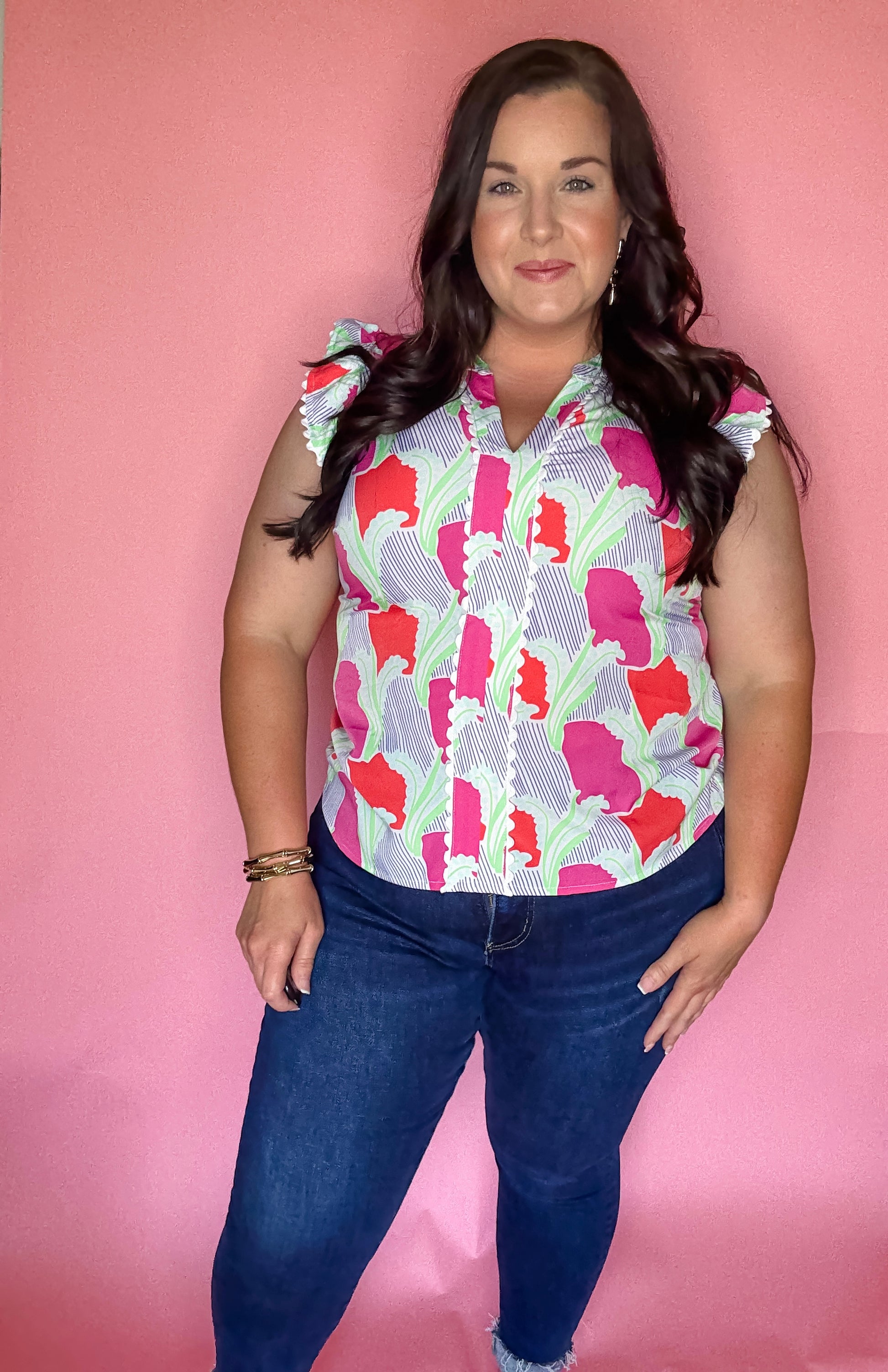 The Kira Top combines classic style with playful details. It features a notch collar and ruffle cap sleeves that add a feminine touch. The scallop ric-rac trim detail enhances its charm, creating a top that effortlessly blends elegance with a hint of whimsy.