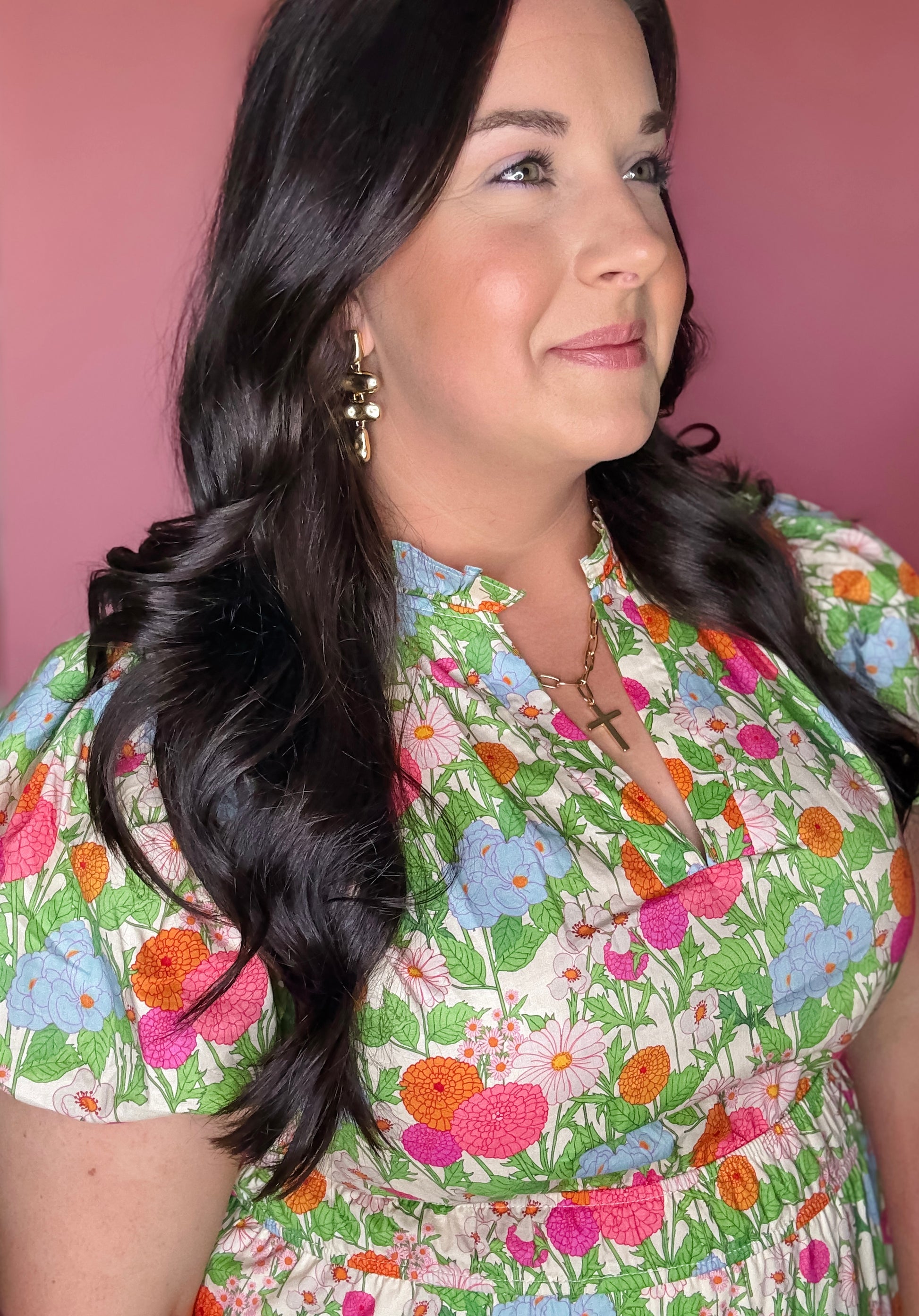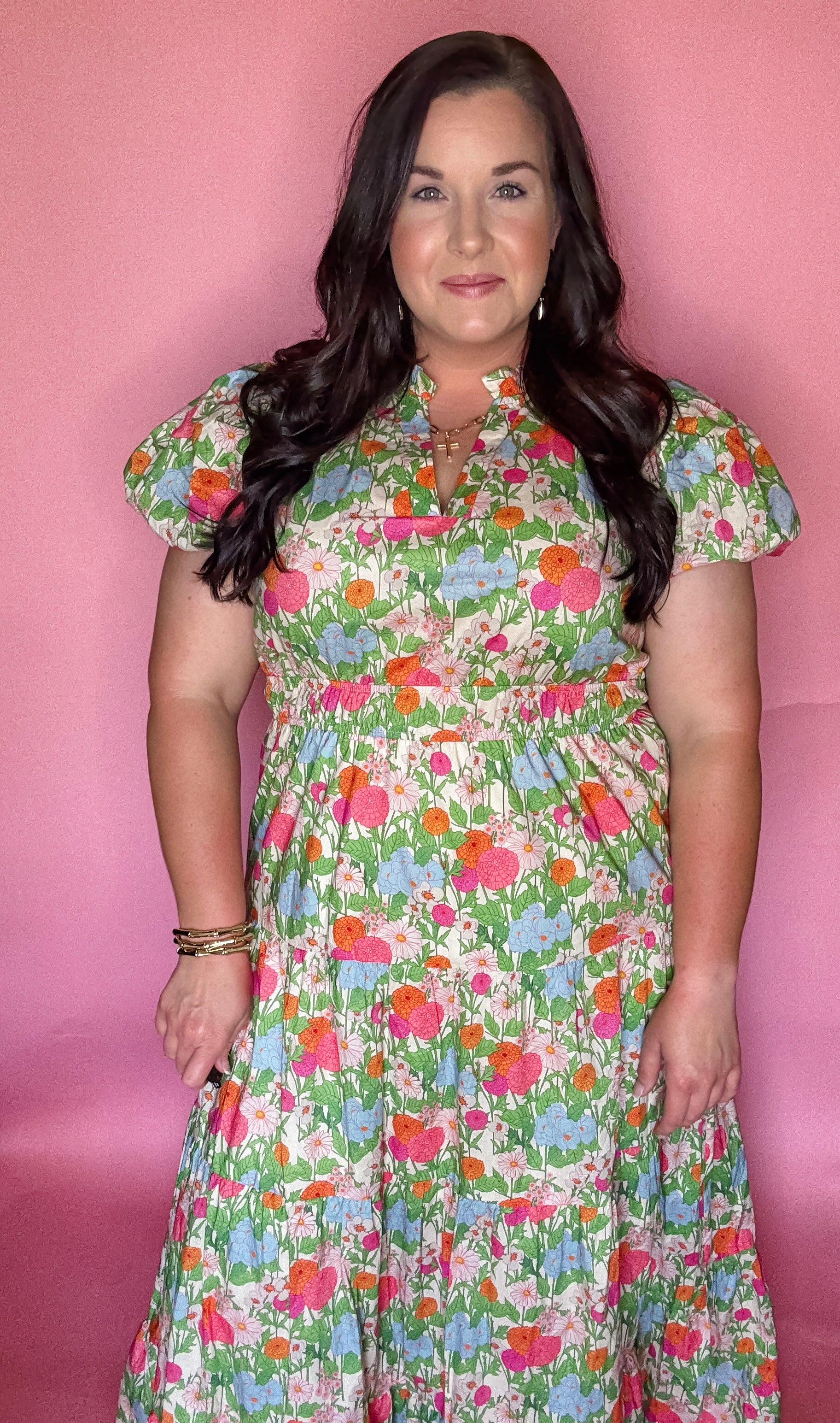 Bring on summer vibes with our Curvy Endless Summer Dress! Featuring a beautiful marigold floral print, this ruffled tiered maxi dress will have you looking effortlessly chic. The v-neckline and puff sleeve add a touch of elegance to this must-have dress. Embrace the warm weather in style!
