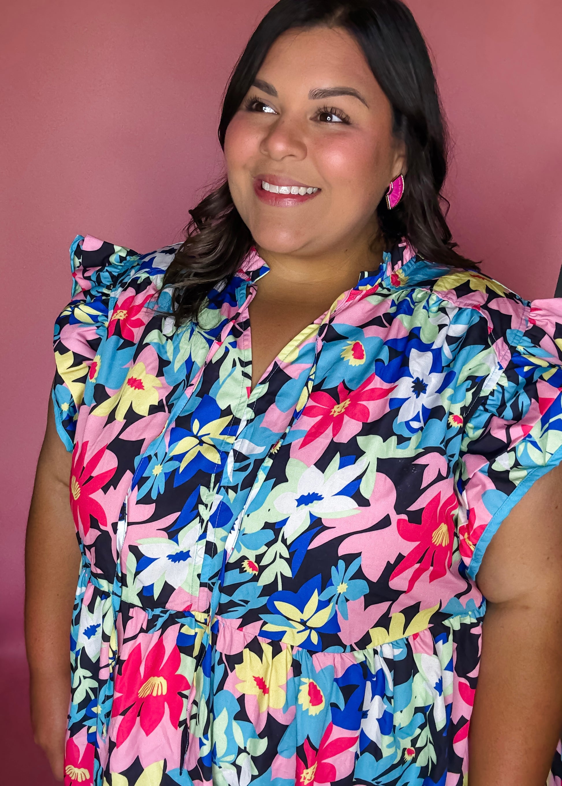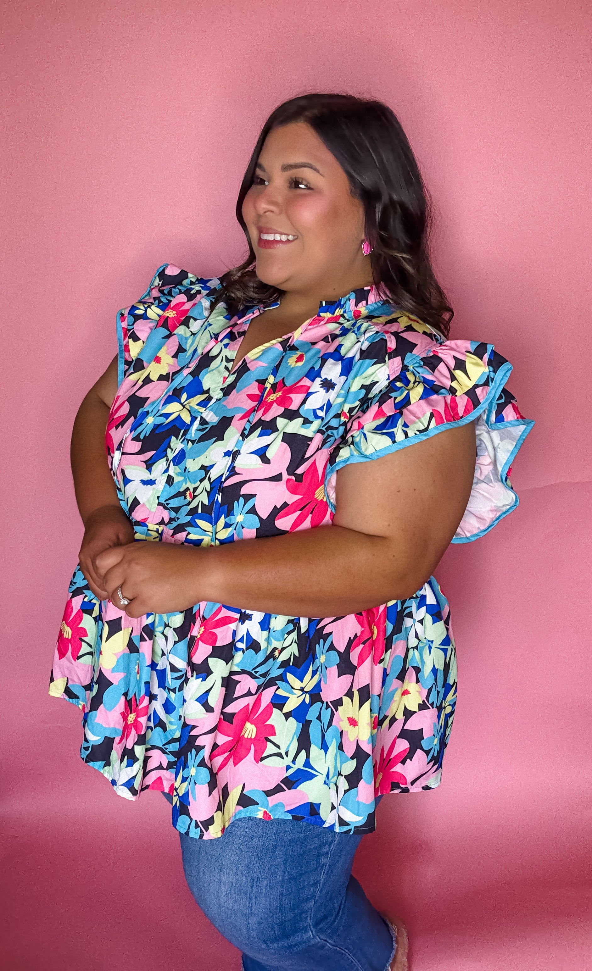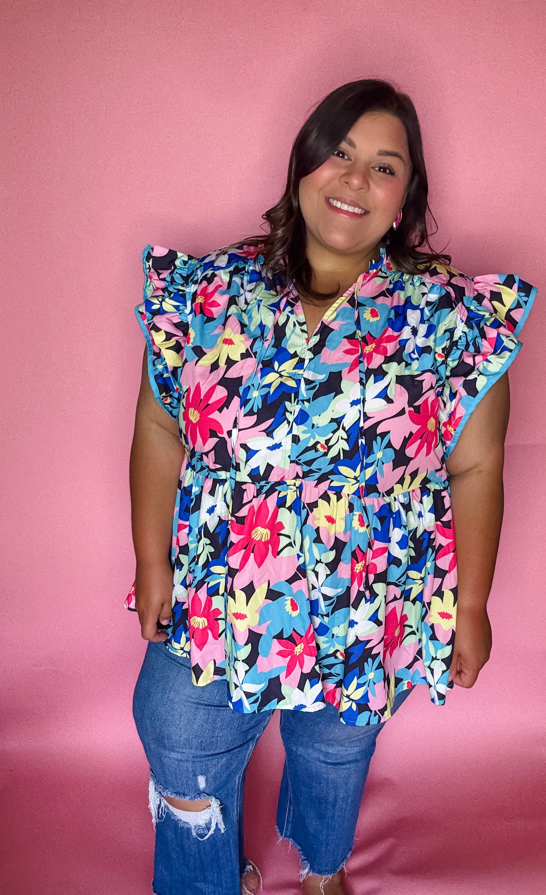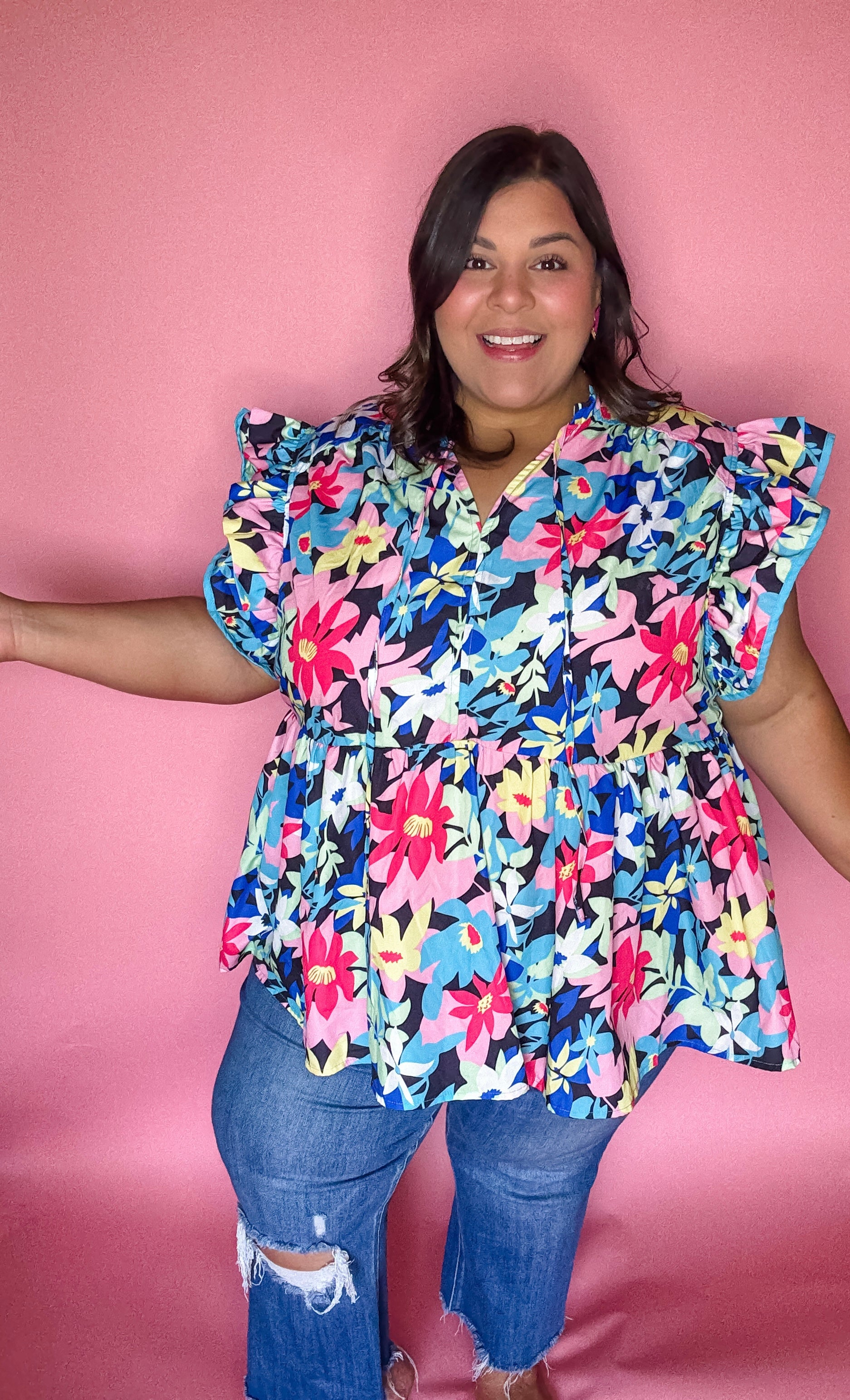The Curvy Fun and Floral Top features a vibrant floral pattern that adds a playful touch to your wardrobe. Complete with flutter sleeves and a tie neckline, this top offers a unique and stylish look that is perfect for any occasion.