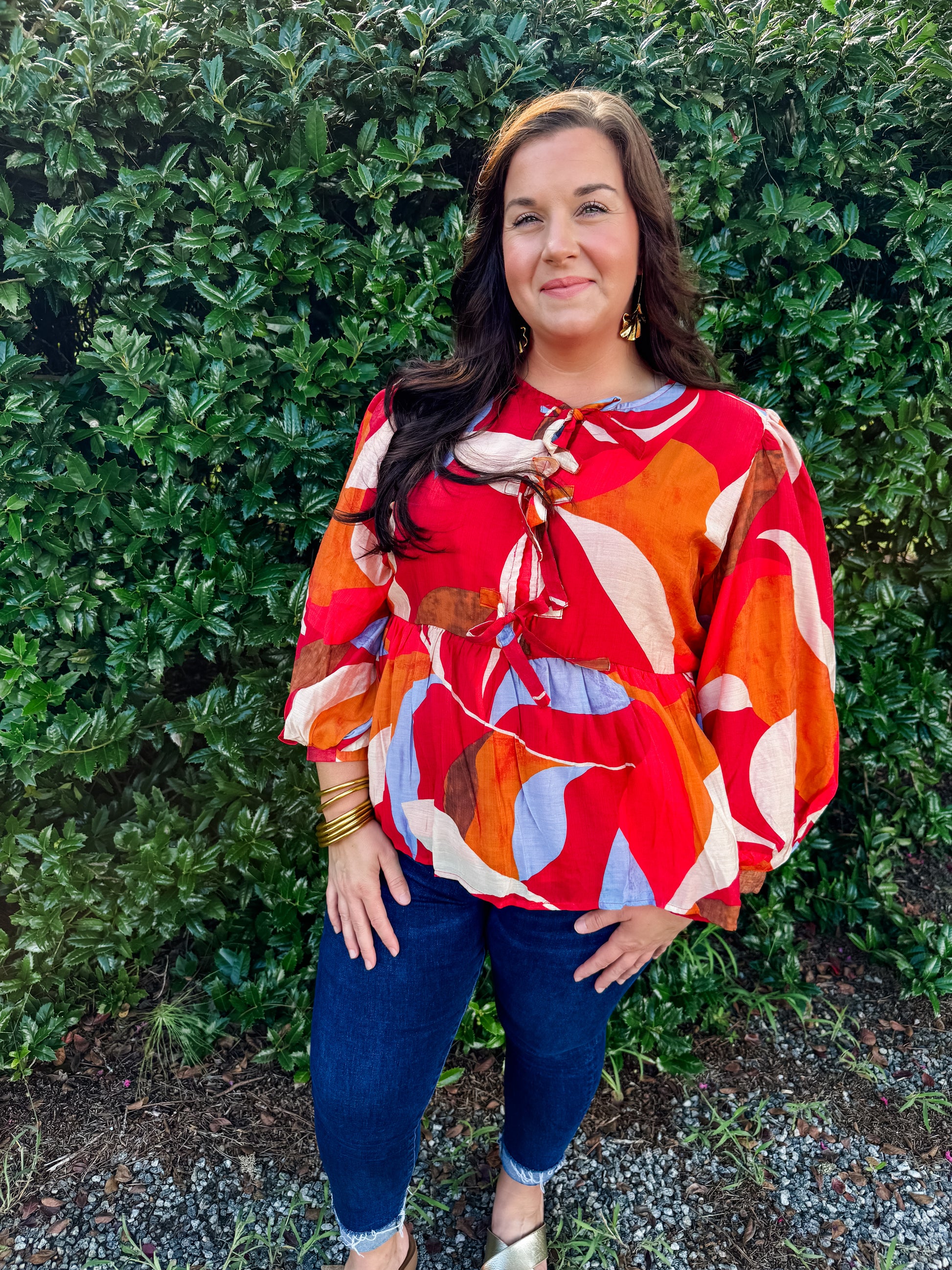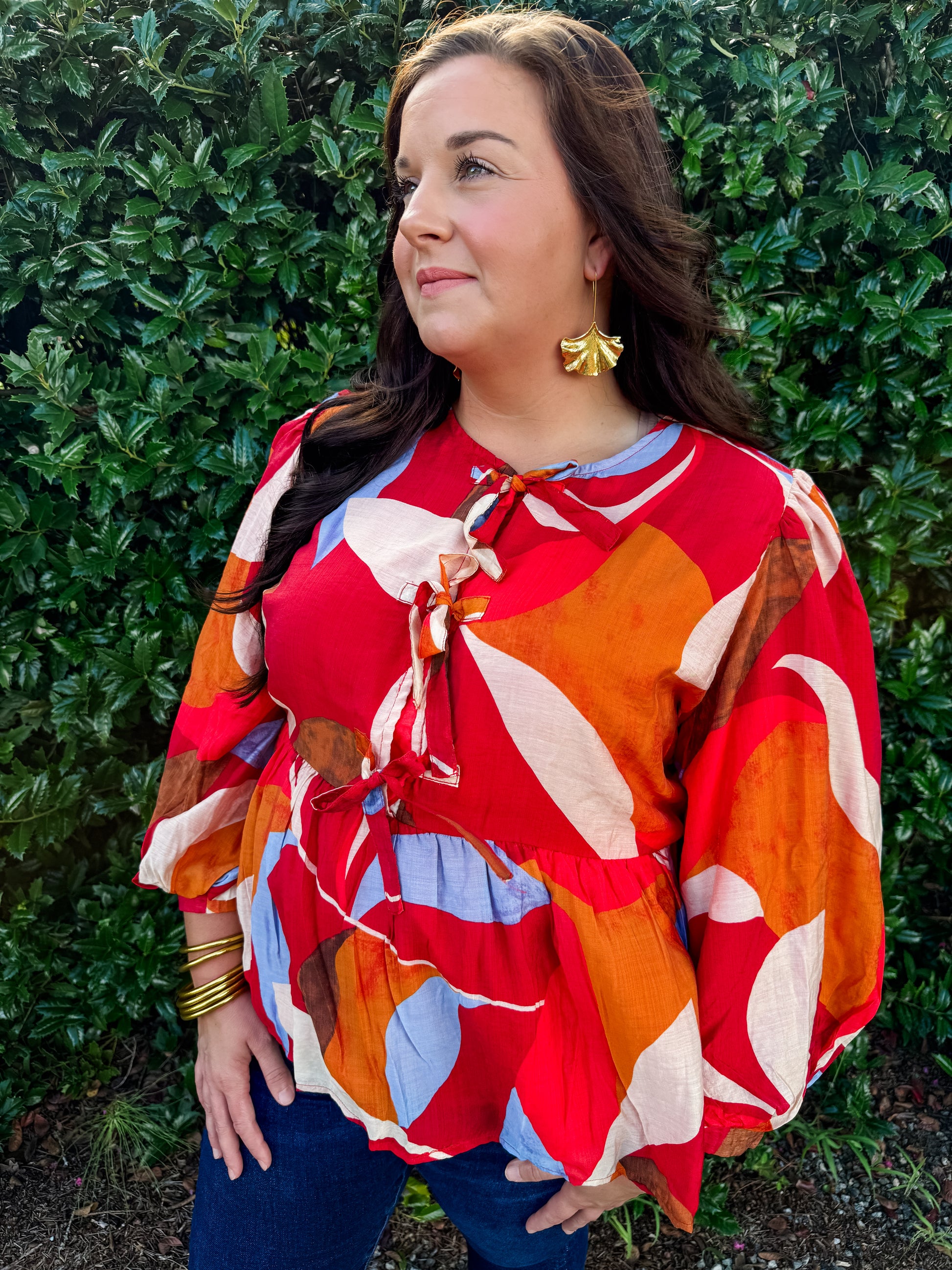 The Sienna Top boasts a unique abstract autumn design, adding a touch of sophistication to any outfit. The bubble sleeves add a playful element, while the peplum style flatters any body type. The triple bow design is a charming detail, making this top a must-have for any fashion-forward individual.