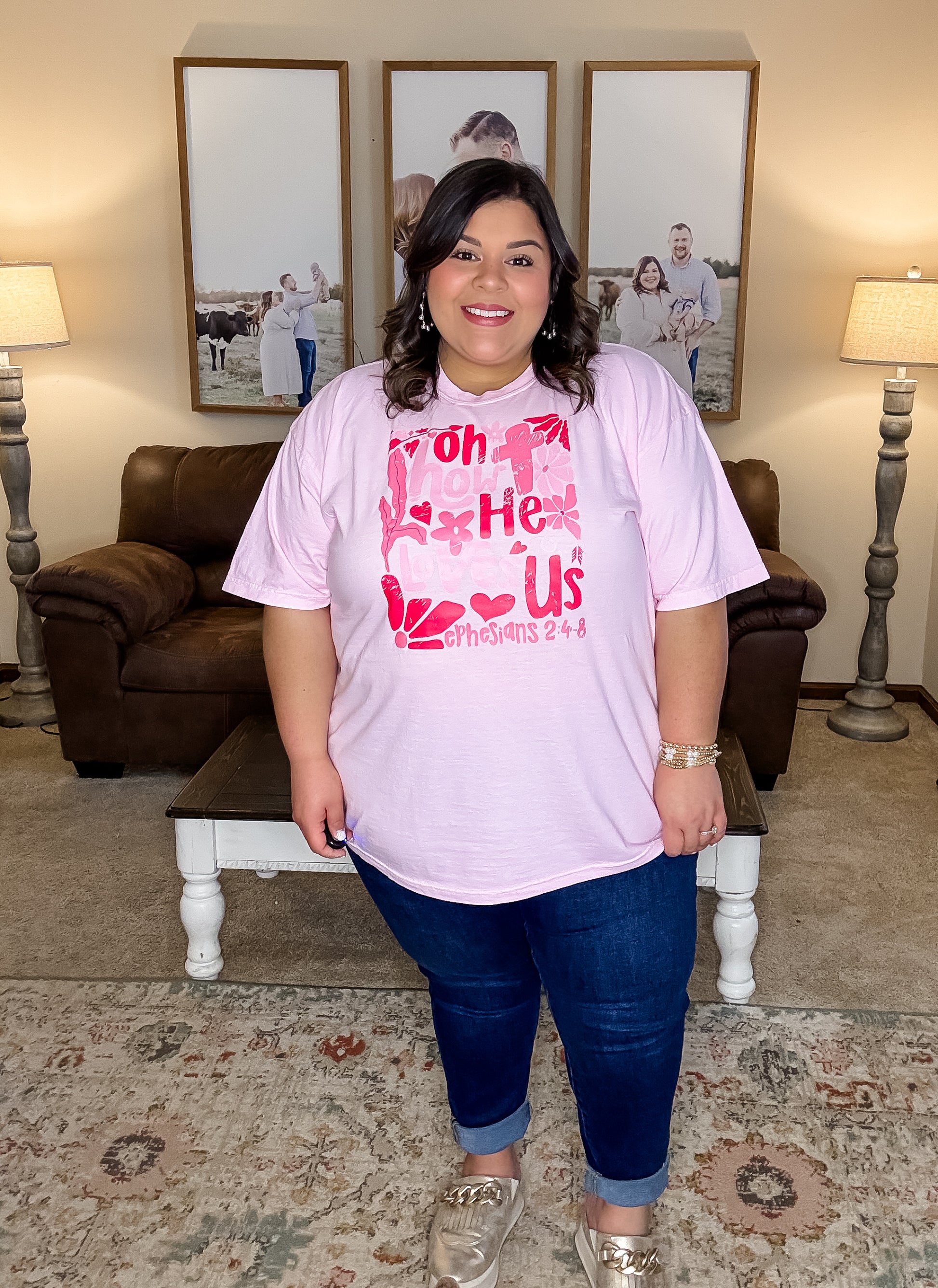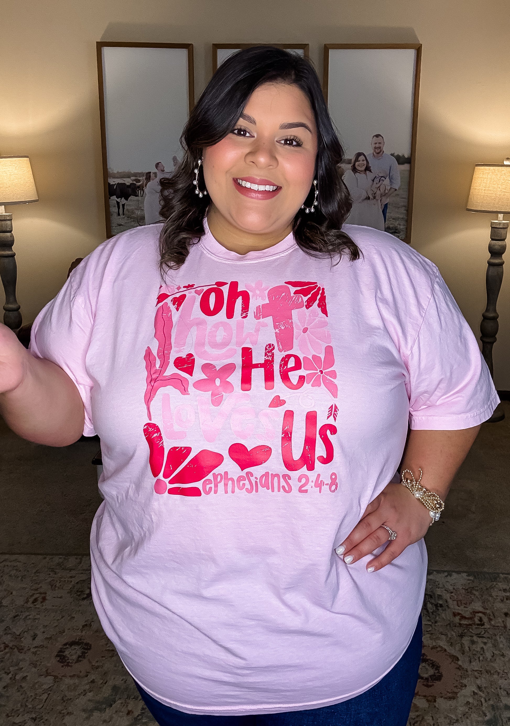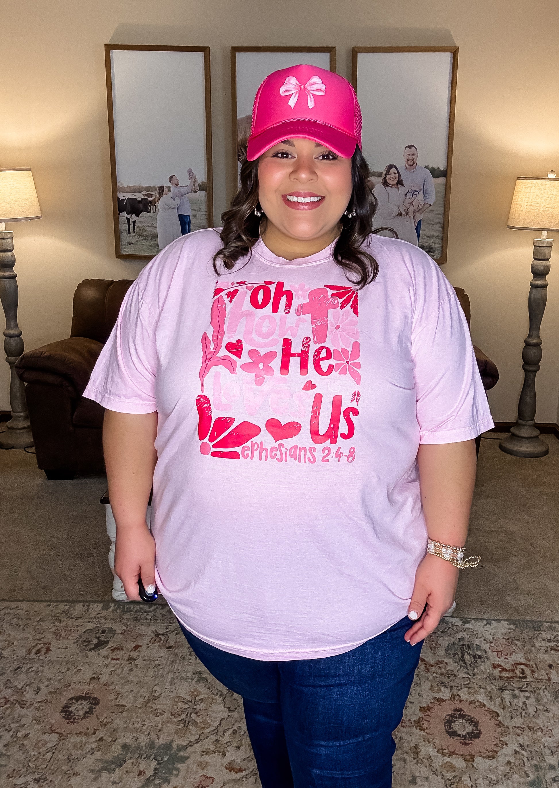 Experience faith in comfort with our Oh How He Loves Us Tee. Made with soft comfort colors and featuring a faith-based graphic, this tee is perfect for spreading love and positivity. In a beautiful blossom pink color, it's a stylish reminder of the power of faith.