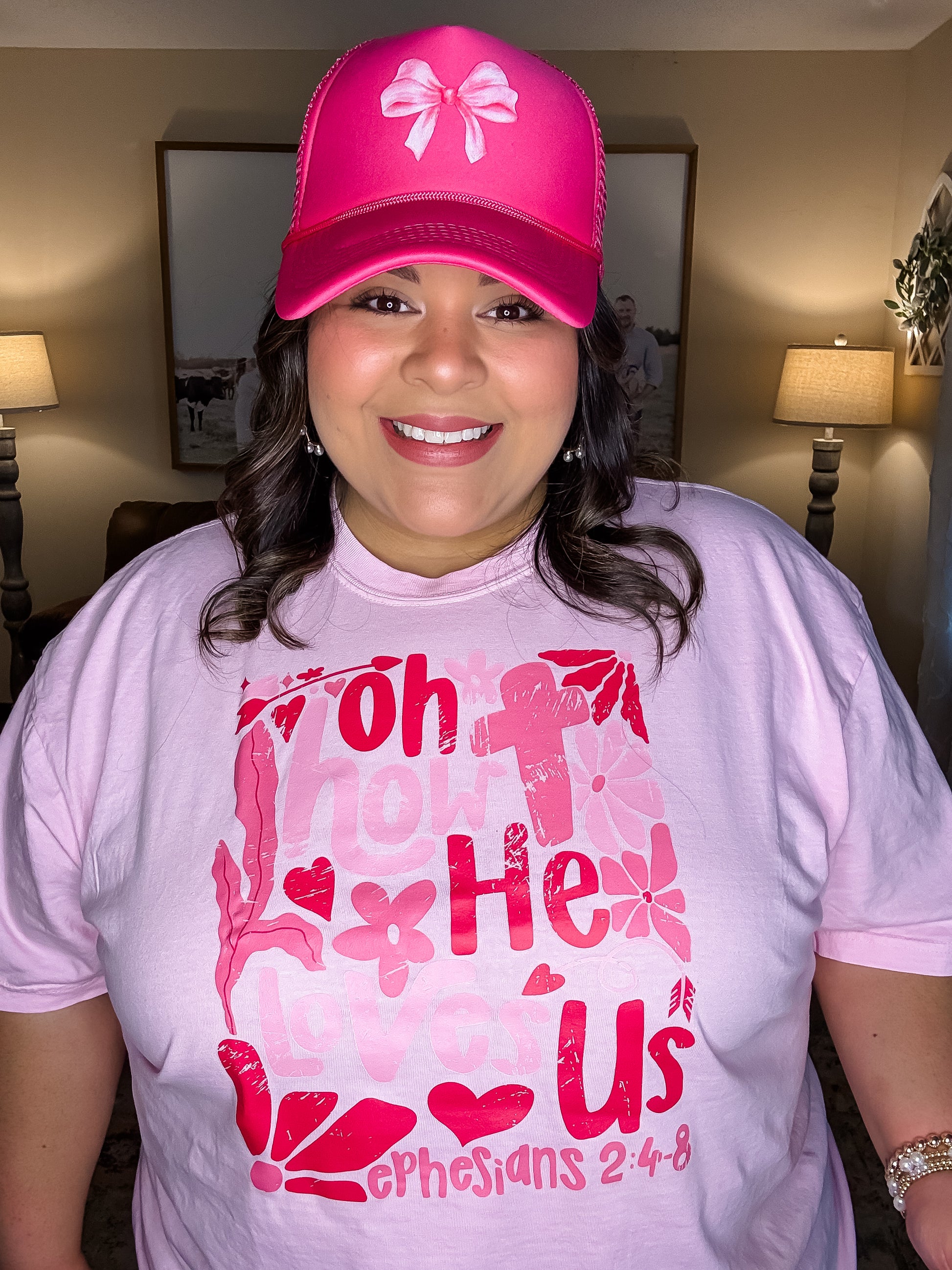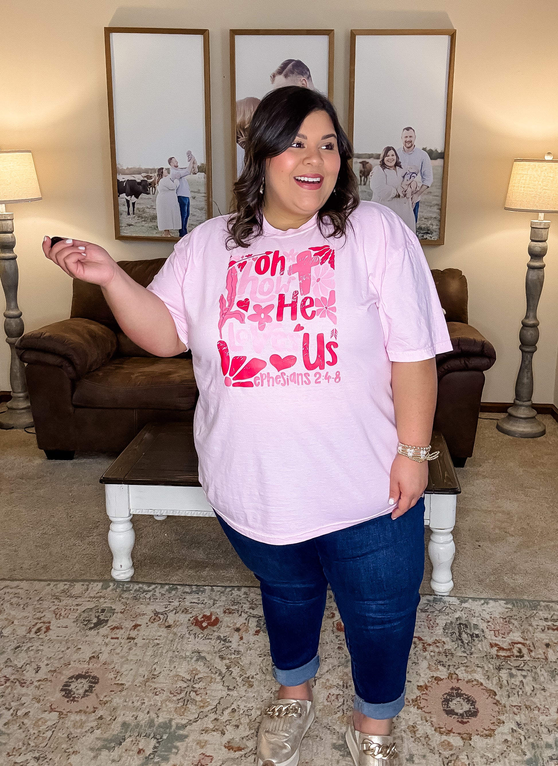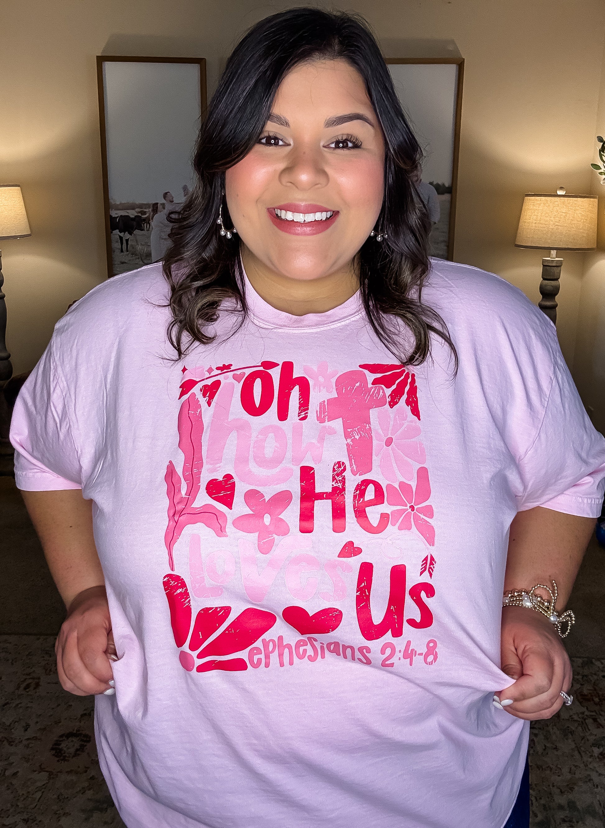 Experience faith in comfort with our Oh How He Loves Us Tee. Made with soft comfort colors and featuring a faith-based graphic, this tee is perfect for spreading love and positivity. In a beautiful blossom pink color, it's a stylish reminder of the power of faith.