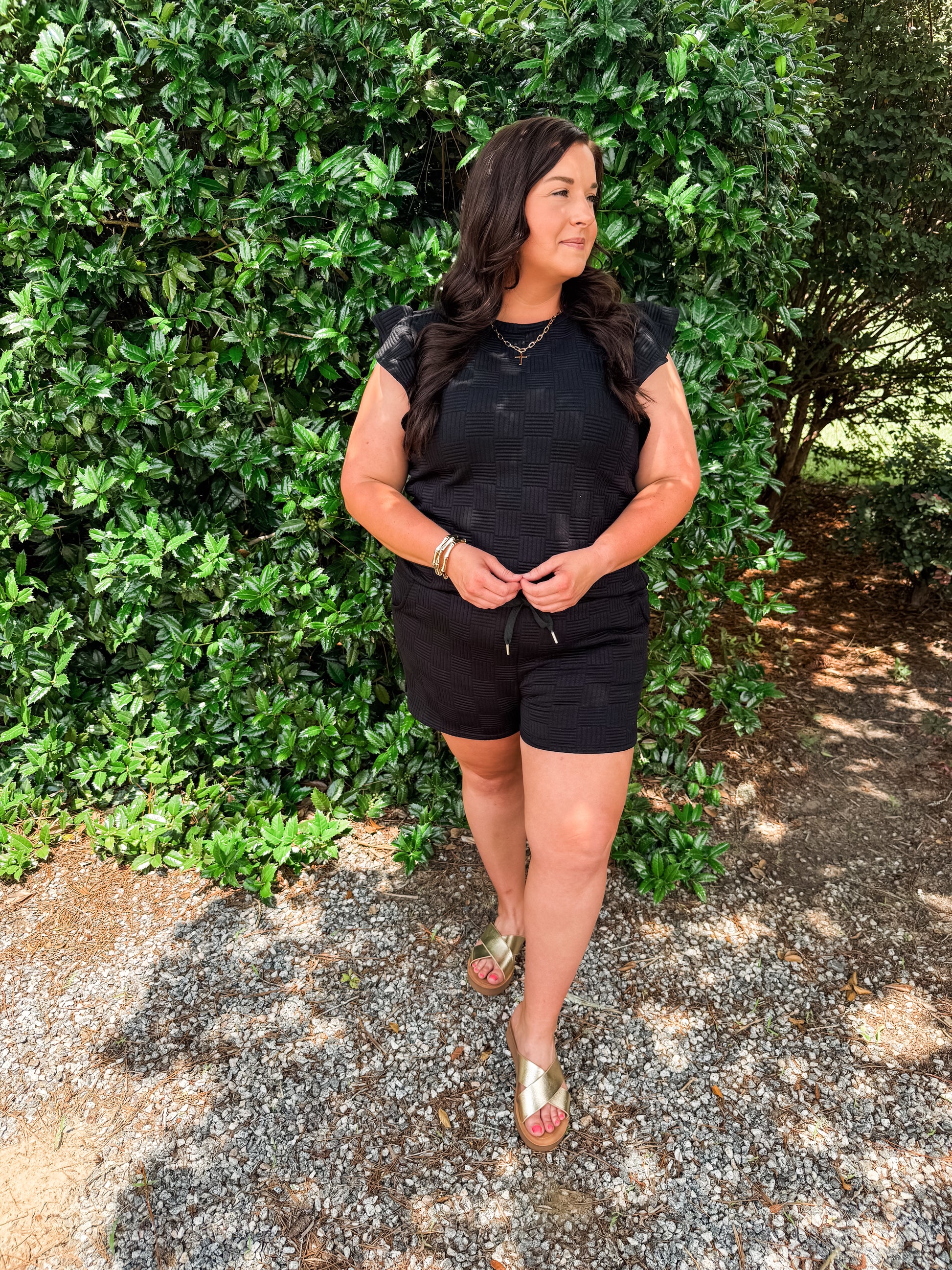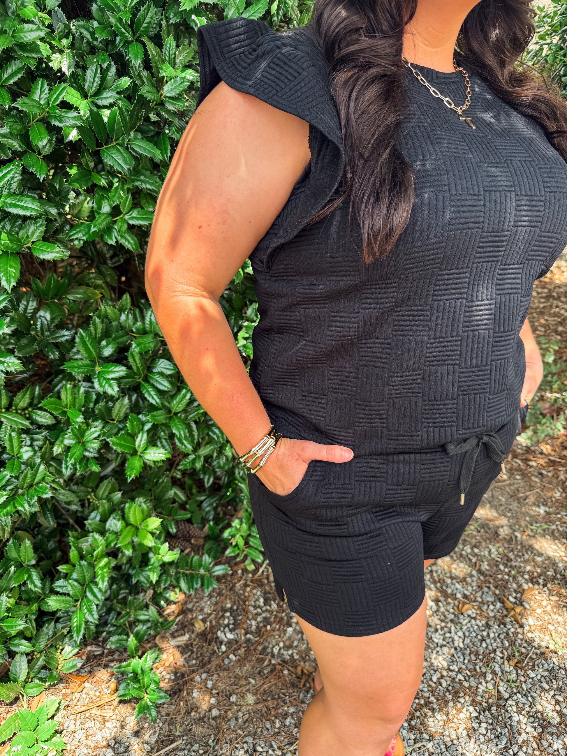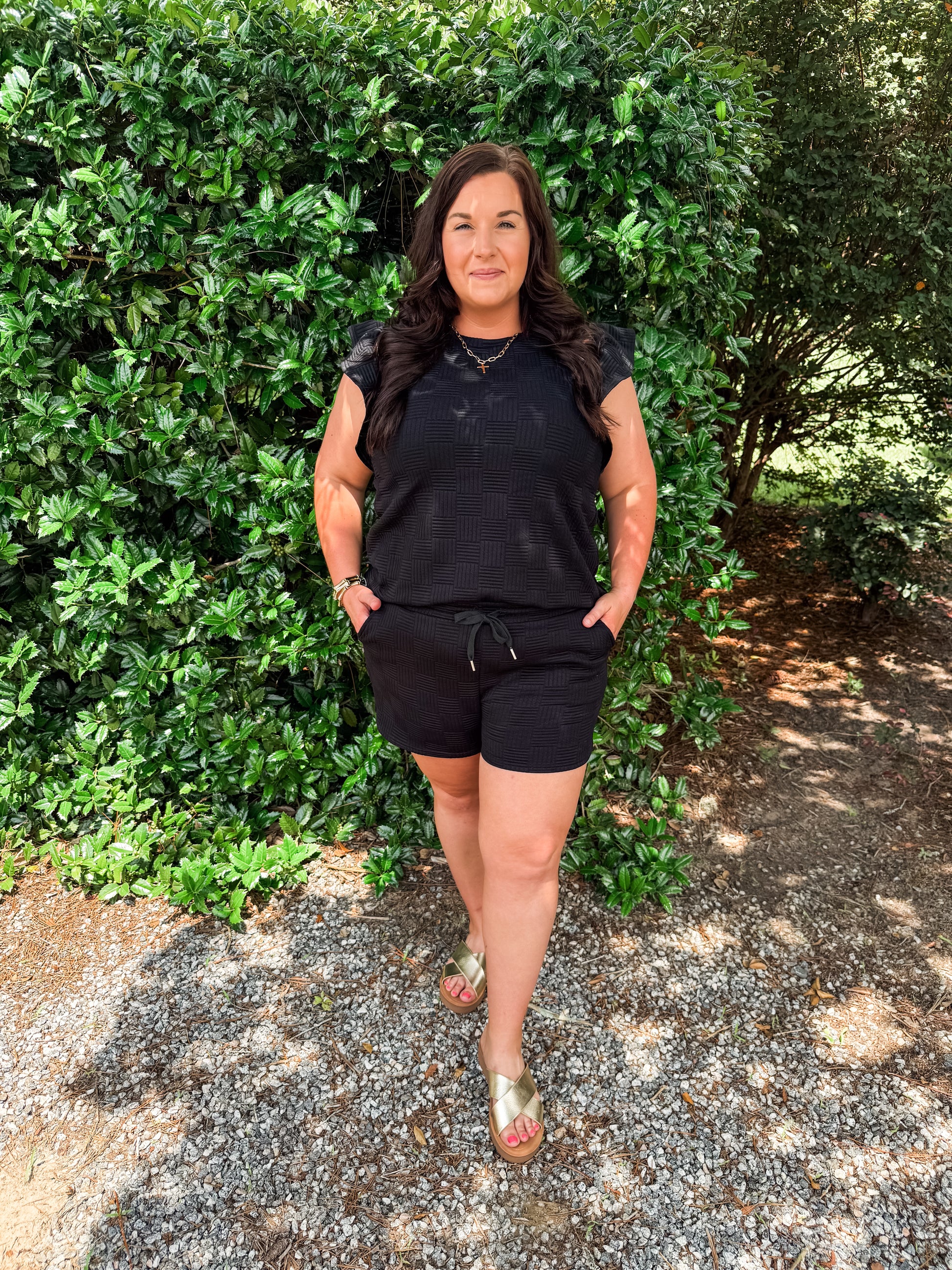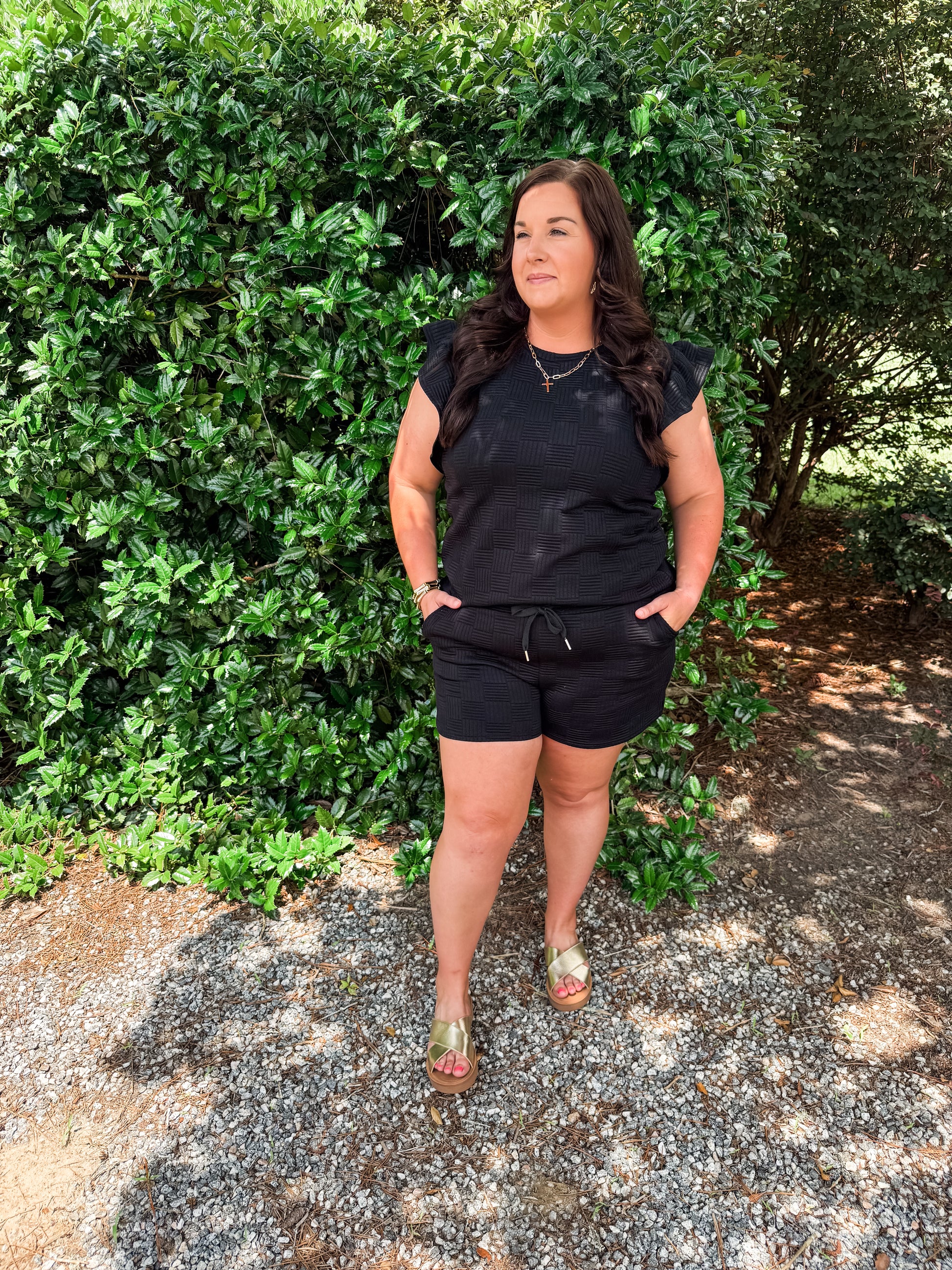 Run your errands in style with this black short set! The quilted material adds texture, while the flutter sleeve and drawstring tie provide a comfortable fit. Don't forget about the pockets - perfect for holding your essentials. Who says running errands can't be chic?!