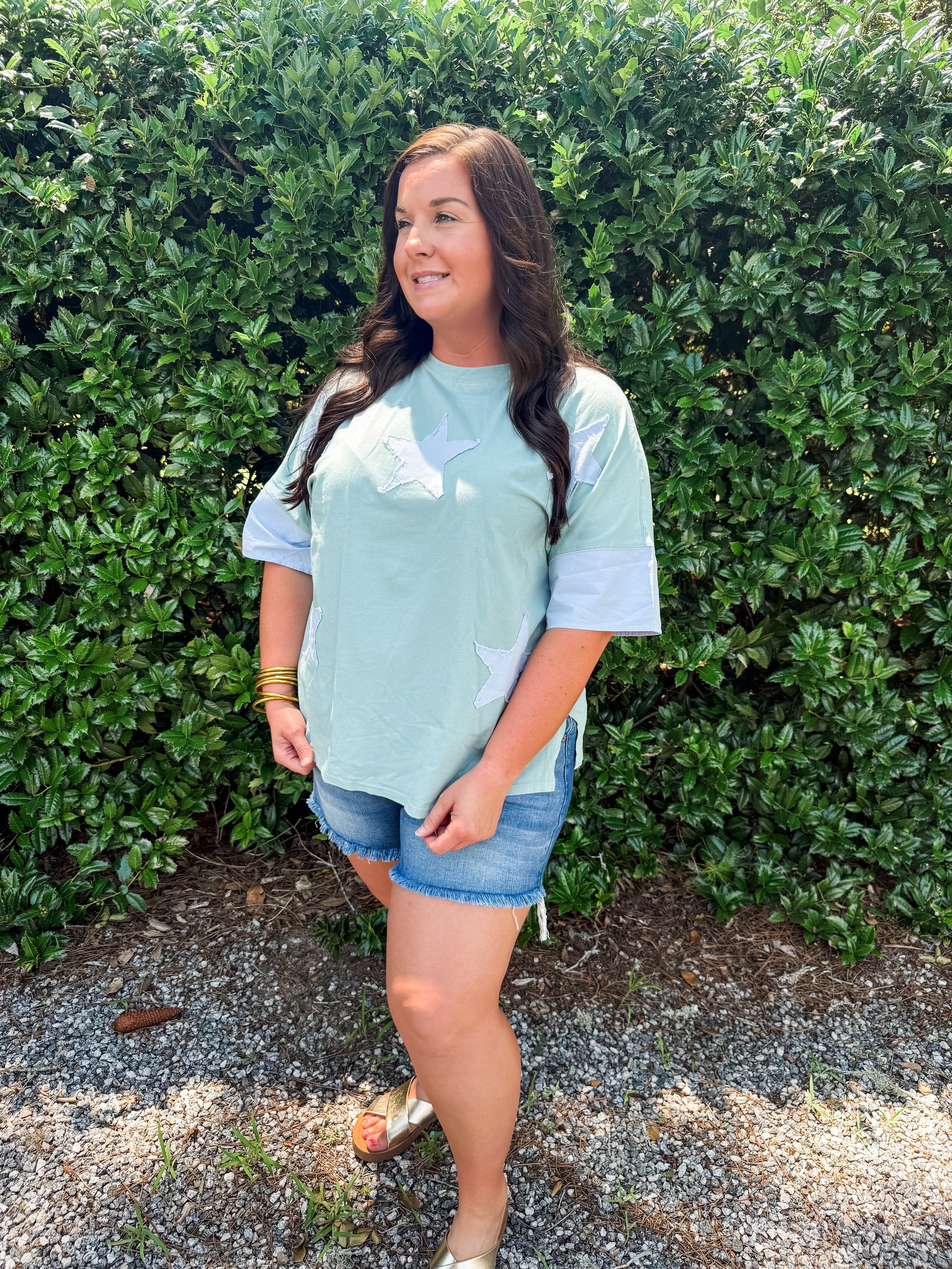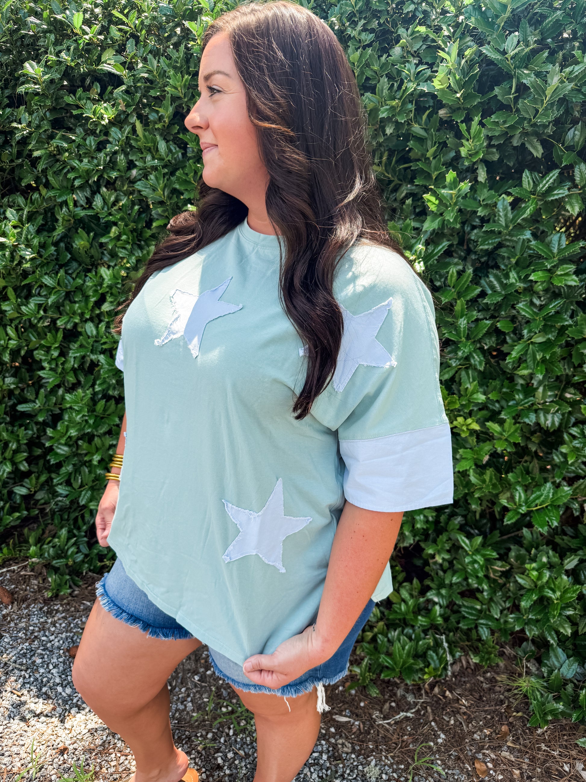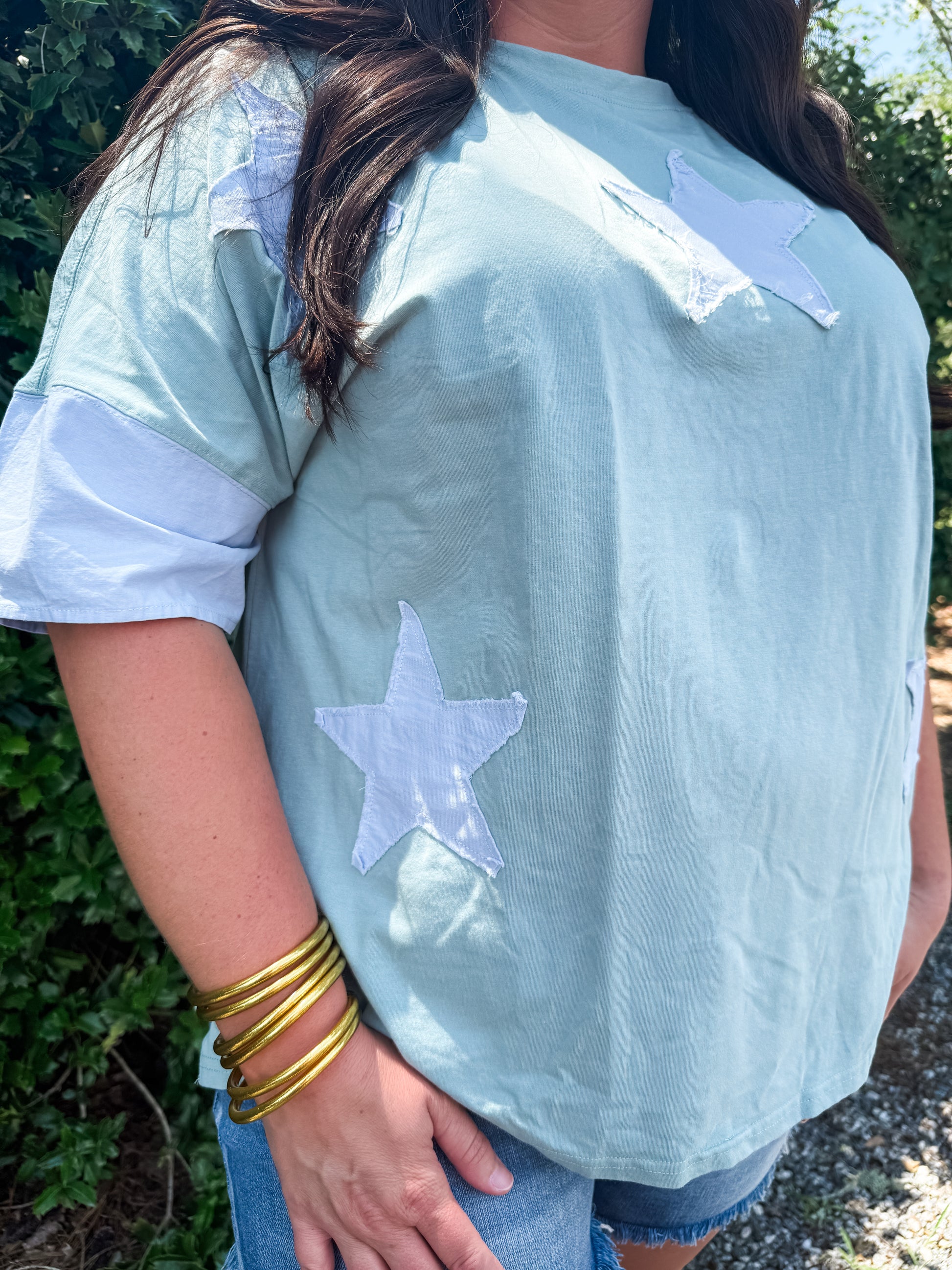 This light sage and blue top features a unique frayed star patchwork design and an oversized fit for a comfortable yet stylish look. The two-tone sleeve adds a touch of contrast. With its round neck, this top is the star of the show.