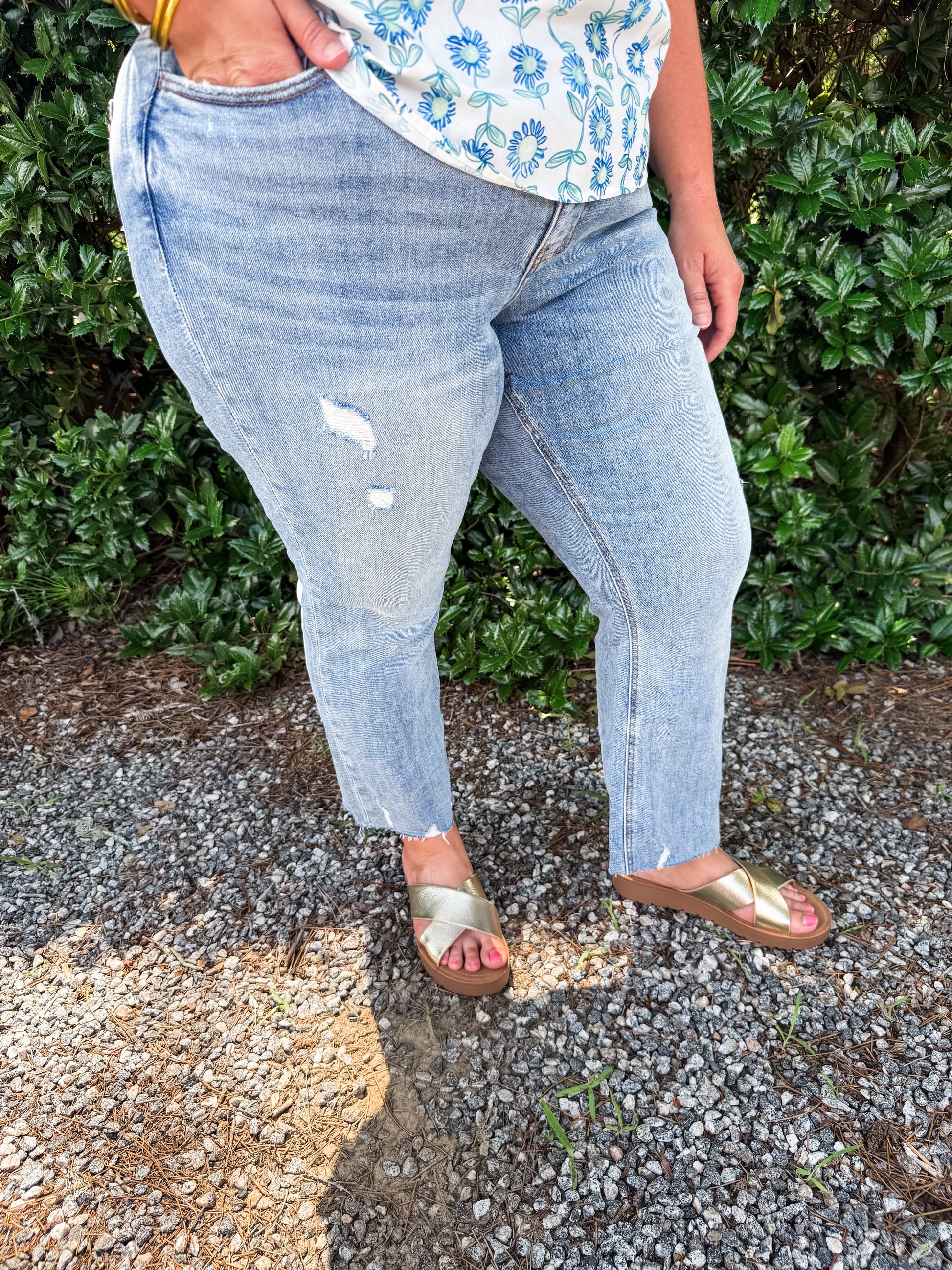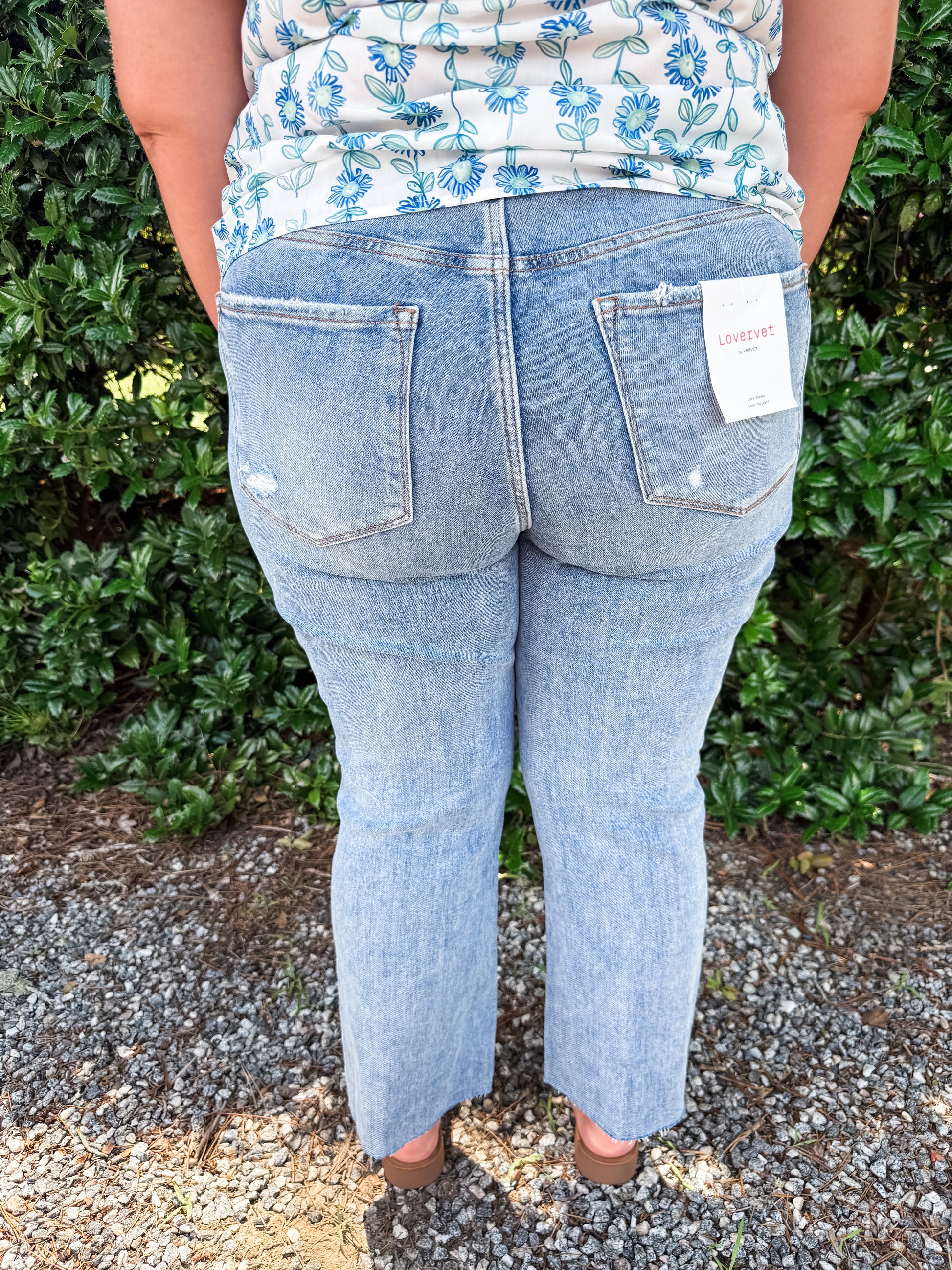 Expertly crafted with a high-rise waist, light wash denim, and raw hem, Lovervet's Cali Kiss Kick Flare Denim CURVY is the perfect blend of style and comfort. Complete with light distressing details, this kick flare design offers a flattering silhouette that will elevate any look.